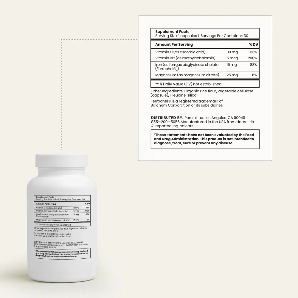 Boost your iron intake and combat anemia with iron and vitamin B12, plus added magnesium and vitamin C for optimal absorption and tolerability. Our daily supplements were designed to work synergistically with any monthly Perelel Multivitamin Pack, and are safe to take before, during and after pregnancy.*